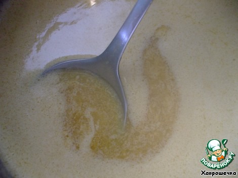 И сразу же вылить эту смесь (воду с содой) в смесь масла с сиропом. Масло с сиропом специально не охлаждать. Масса должна вспениться.