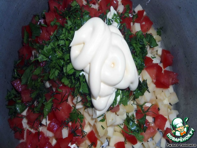 Из помидоров убрать середину и тоже нарезать кубиками.