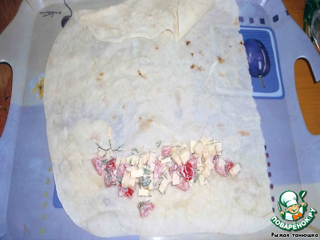 Лаваш разрезать пополам, на половинку положить немного начинки и свернуть, загибая края.