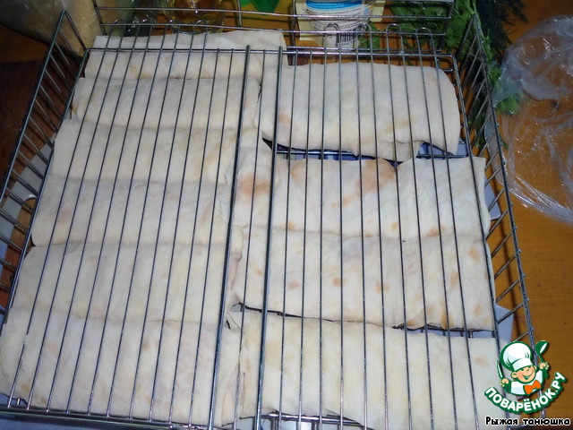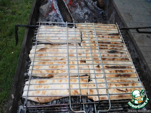 Жарить на мангале на небольшом жаре, часто переворачивая. Готовится очень быстро. Главное, чтобы лаваш хорошо зарумянился, а начинка хорошо прогрелась.