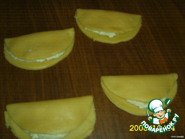 Раскатываем тесто, вырезаем из него кружочки (я это делала с помощью небольшого блюдца и ножа). И на эти кружки выкладывааем нашу творожную начинку.