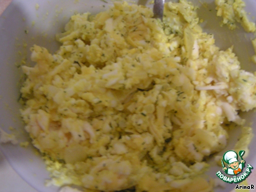 Для начинки нарезать лук, прогреть его в сливочном масле, соединить с нашинкованными яйцами, тертым сыром и мелко нарезанным укропом