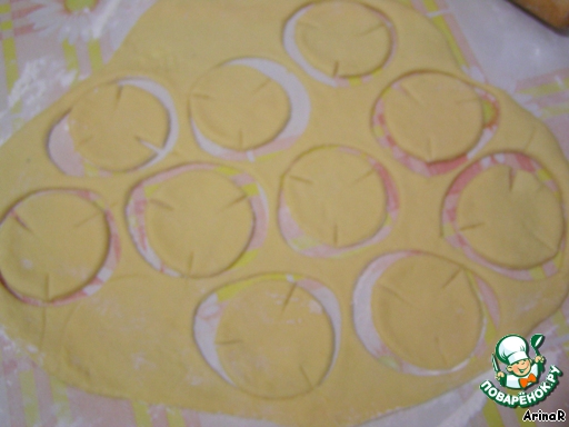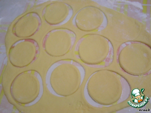 Раскатать тесто, при помощи чашки вырезать кружочки