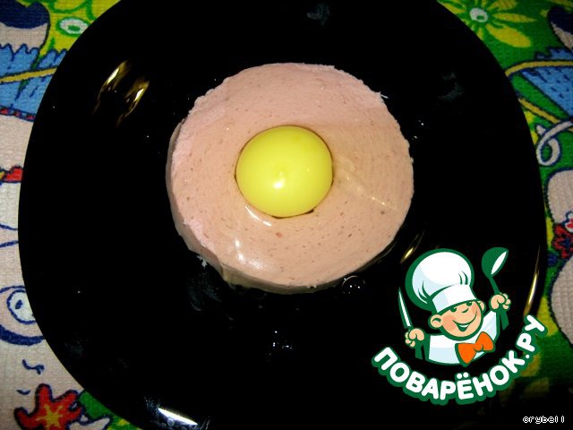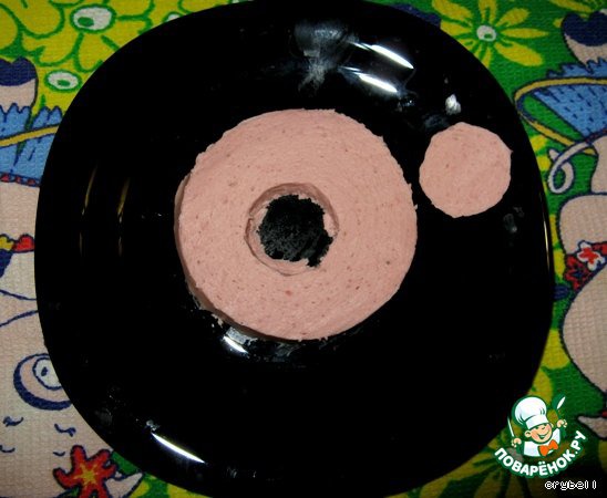 Кружок колбасы положите на (НЕ СМАЗАННУЮ!) тарелку. Если смажете маслом , вулканчик не получится ;)