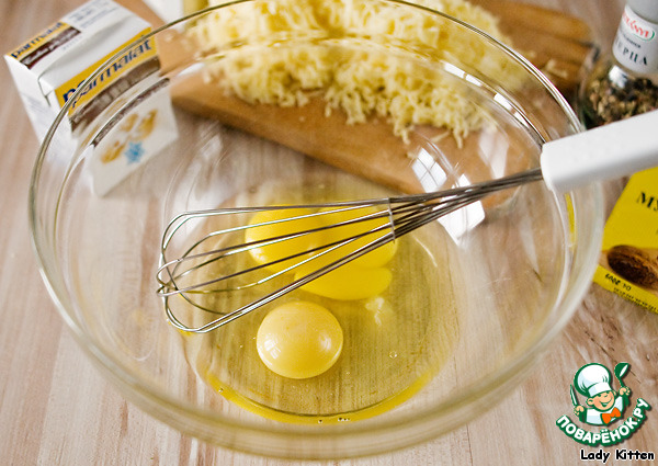 Яйца слегка взбить, добавить сливки, треть тертого сыра, мускатный орех, посолить и поперчить.