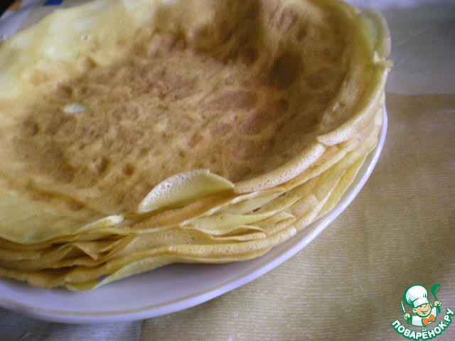 Для запеканки нам нужно 7 блинов. Вы можете испечь их по любому знакомому вам рецепту. Я взбиваю миксером 2 яйца с солью и сахаром. Продолжая взбивать, вливаю половину холодного молока. Затем добавляю просеянную муку. И, когда вся мука равномерно разойдется, доливаю постепенно остальное молоко, регулируя густоту теста. Добавляю в тесто столовую ложку растительного масла, перемешиваю. Блины пеку на сухой сковороде.