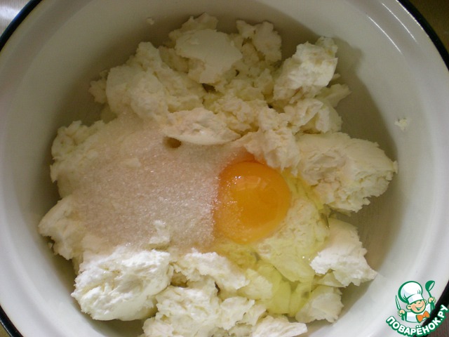 Для творожной прослойки нужно в творог добавить одно яйцо, размягченное сливочное масло, манку, сахар и пробить эту массу блендером до однородного состояния.