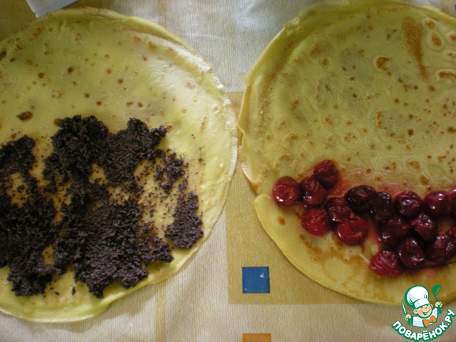 Теперь займемся сборкой нашей запеканки. Три блина нужно смазать маковой начинкой. На три блина уложить вишню. Начинку распределите до половины блина. Чтобы удобнее было сворачивать блины. Теперь сверните блины в трубочку.