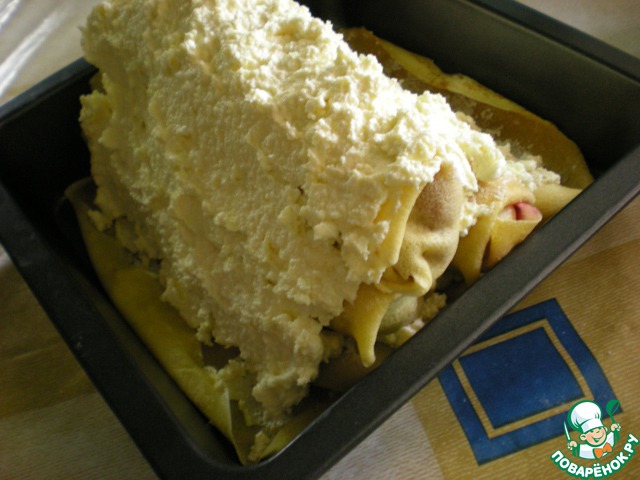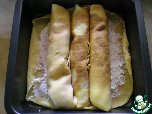 Один блин положите в формочку для запекания. Я ничем ее не смазывала, у меня блин не прилип. Смажьте слегка этот блин творогом и уложите на него блинные трубочки, чередуя начинки. В нижний слой положите три блина, смажьте творогом. Во второй – два, опять смажьте творогом и в третьем слое - один блин.