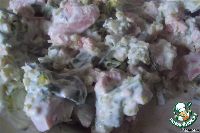 Ветчину нарезать мелкими кубиками.