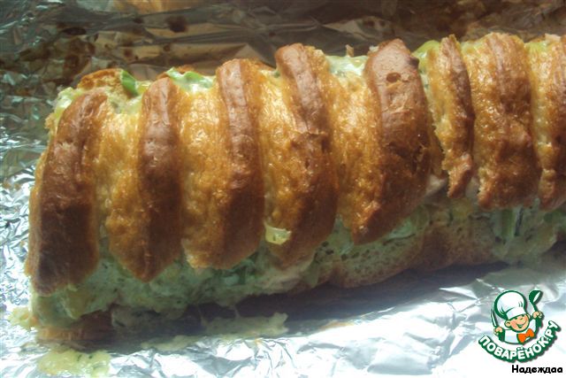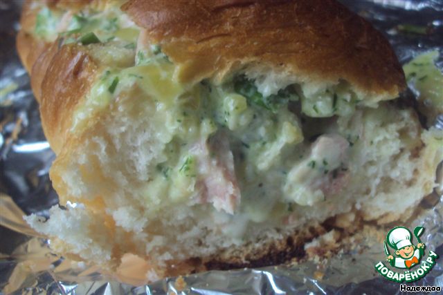 | Фаршированные багеты на сайте есть, но немного и с другими начинками. Рецепт взят из кулинарного журнала |