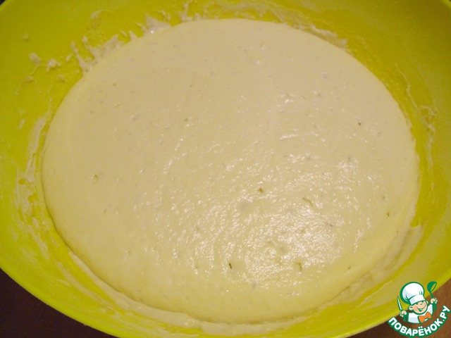 К утру тесто поднялось вот так. Добавляем 2 яйца, соль, соду и масло. Хорошо перемешиваем и даем тесту отдохнуть 20-30 минут.
