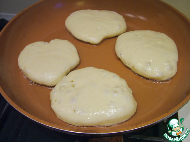 Огонь делаю чуть слабее среднего, чтобы оладьи успевали прожариться до середины, не подгорев. Когда на поверхности оладьи начинают лопаться пузырьки, переворачиваю.