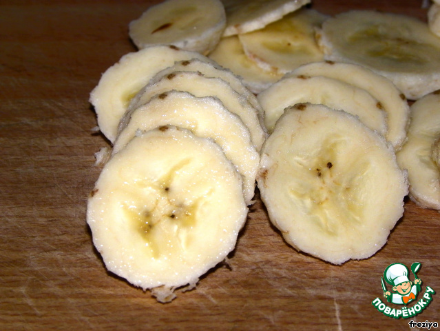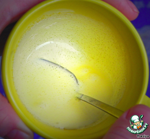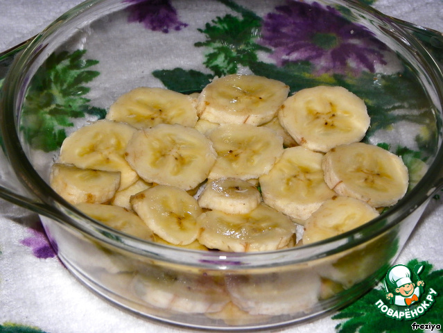 Желток отделяем от белка и взбиваем с 4 чайными ложками сахара. Лучше взбивать миксером, но я взбивала руками, понятно, что дольше. Взбивать нужно, пока не станет белого цвета. Выливаем его на бананы.