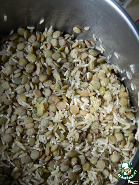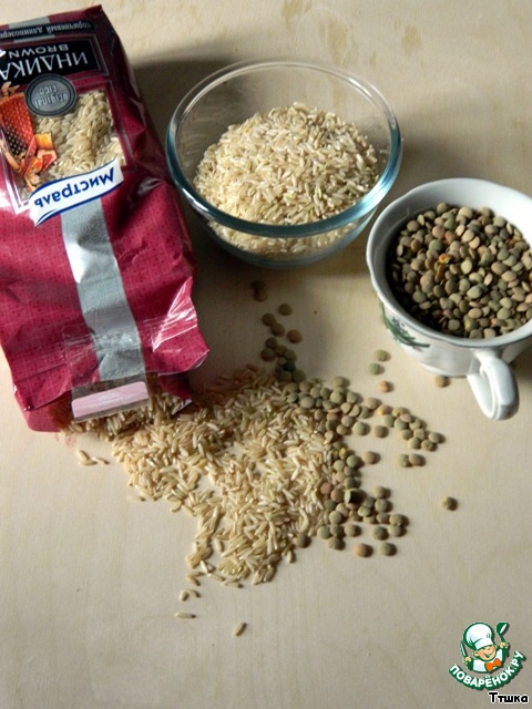 Необходимо взять 1 стакан чечевицы и 1,5 риса, у меня коричневый длиннозерный, а, вообще, можно взять любой длиннозерный. Рис промыть и откинуть на сито.