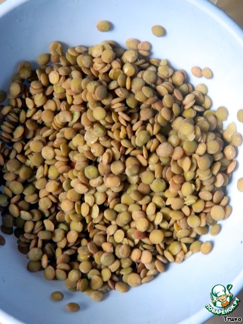 Чечевицу промыть, залить 4 стаканами воды и отварить до полуготовности. Воду слить и откинуть чечевицу на дуршлаг.