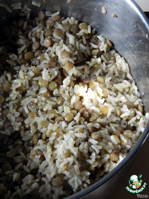 Смешать в кастрюльке с толстым дном рис и чечевицу, залить 2,5 стаканами кипятка, посолить. Поставить на медленный огонь, накрыть крышкой и варить до готовности риса и чечевицы. Убрать с огня.