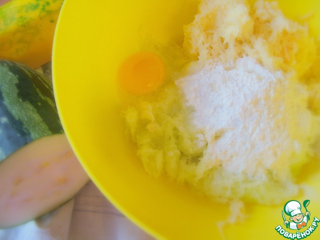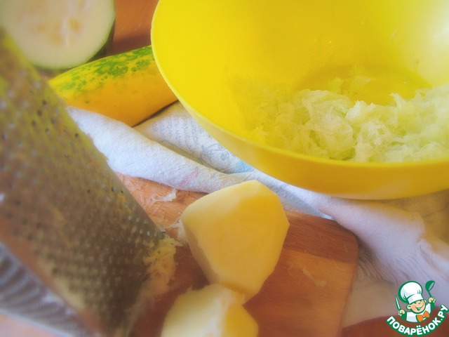 Я беру примерно одинаковое количество картошки и кабачка и натираю на мелкой терке. Если овощи очень сочные, то можно немного отжать сок.