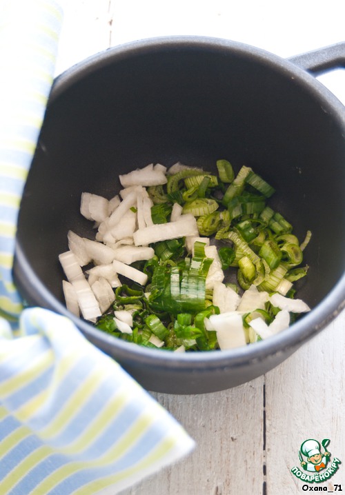 В сотейнике разогреть масло (2-3 ст. ложки), добавить мелко нарезанный лук, потушить его 1-2 минуты, затем добавить порезанную черемшу и оставить тушиться на слабом огне 2-3 минуты.