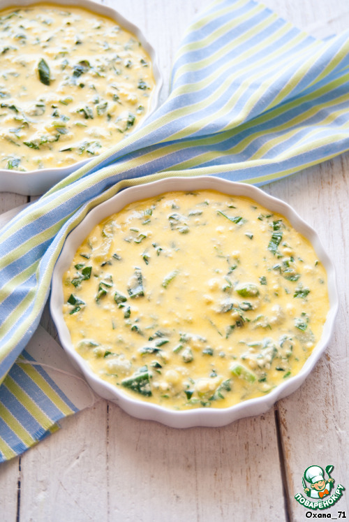 Затем в эту смесь добавить черемшу, размешать и вылить в заранее приготовленные две формочки, смазанные маслом.
