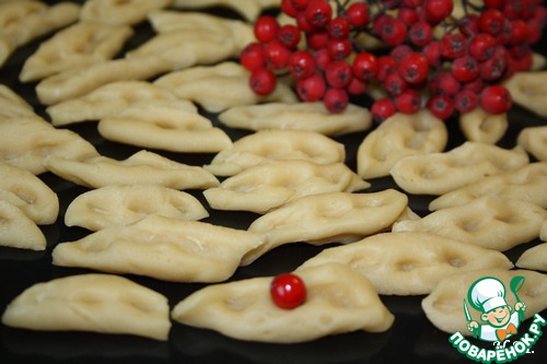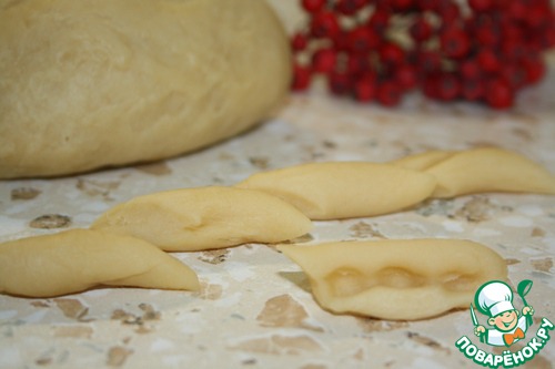 Затем от теста отрезаем кусочек, катаем "колбаску", делим ее наискосок на несколько частей по 2-3 см. Теперь на кусочек ставим пальцы, придавливаем и немного прокатываем на себя, чтобы получились ложбинки. Так поступаем с каждым кусочком.
