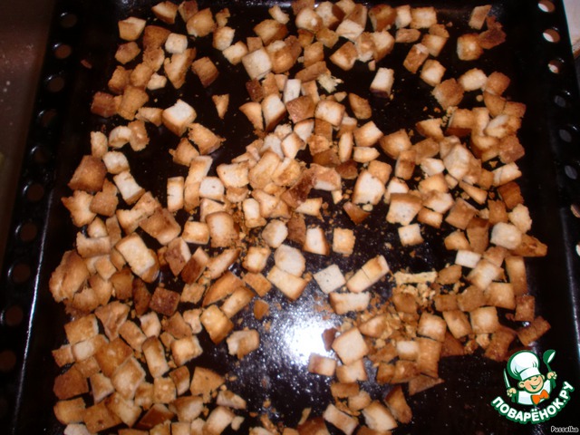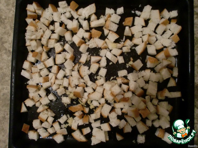 Режем батон на кубики, добавляем смесь из чеснока и оливкового масла, ставим в духовку.