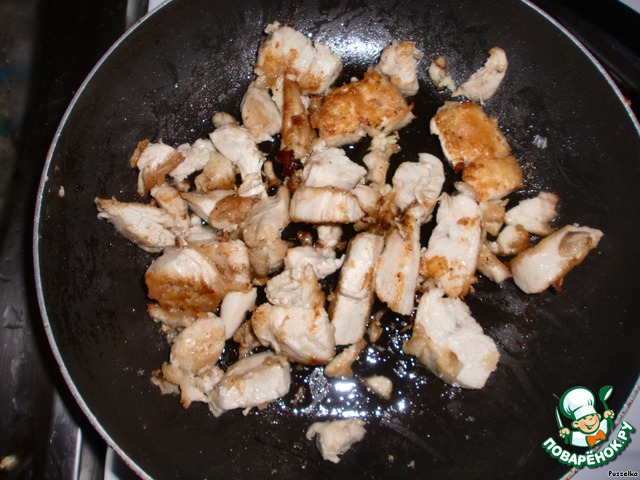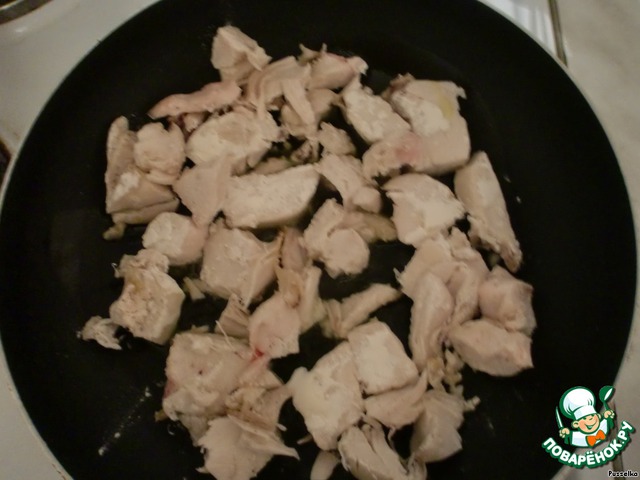 Филе курицы режем на кусочки, обваливаем в муке и жарим до румяной корочки.