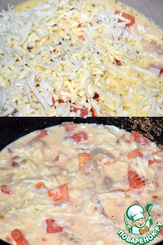 К вышеполученному фаршу добавим взбитую смесь, натертый на крупной терке сыр, перемешаем хорошо. Выложим в смазанную растительным маслом и обсыпанную сухарями чашу МВ.