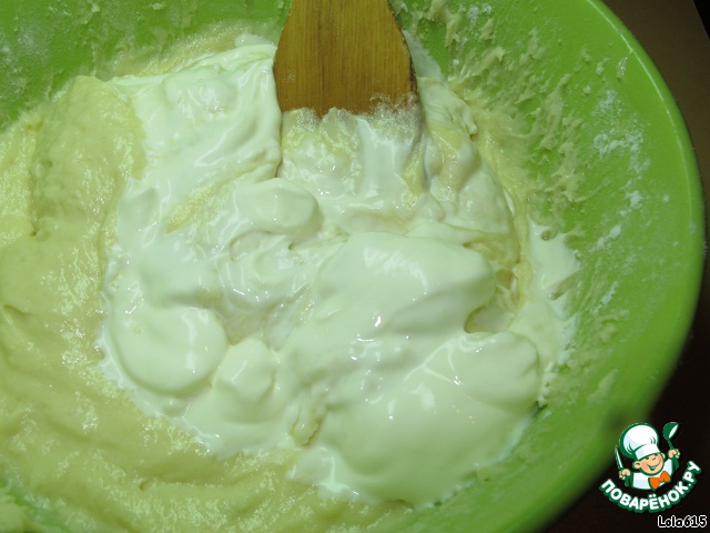 Добавлять по одному белку, после каждого белка взбивать не менее двух минут. Вот такая масса получается с добавлением всех белков.
