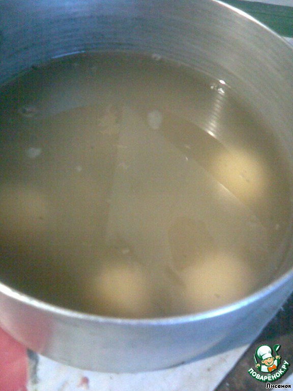 Яйца взбиваем с бульоном и содой. У меня бульон оставался от варки курицы.