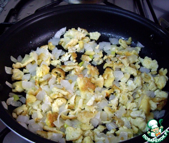 2 яйца взбиваем, выливаем на сковороду и разбиваем лопаткой на кусочки.
