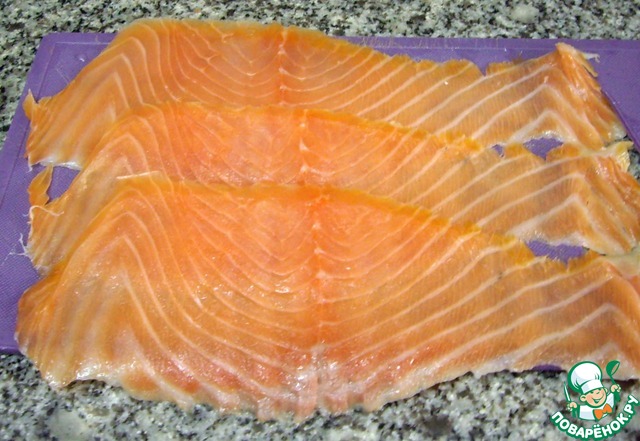 Лосось подкопченный режем довольно мелко и добавляем к рису.