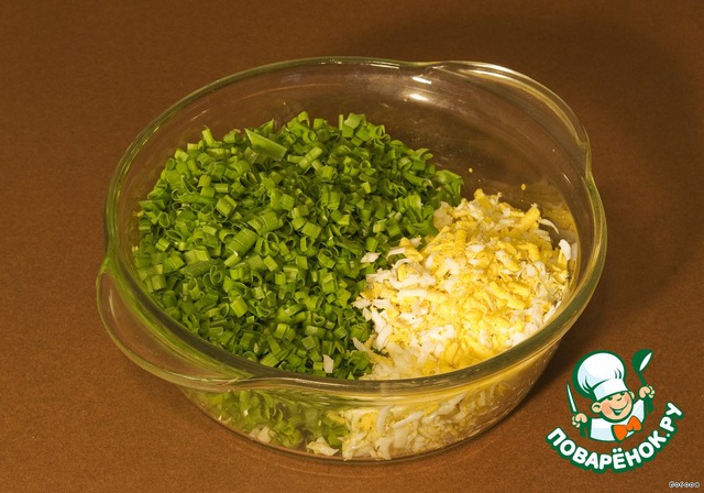 Пока тесто "отдыхает" нарежем зеленый лук и на терке натрем вареные яйца.Солить не нужно, только заправить черным перцем для вкуса.