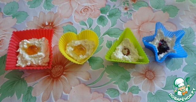 Выкладываем в формочки, заполняя половину, затем кладем по капельке черничный, облепиховый, абрикосовый джемы и орешек.