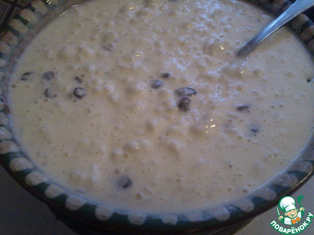 Смешаем яйца, сметану, отварной рис, изюм и 2 ложки сахара. Слегка взобьем вилкой.