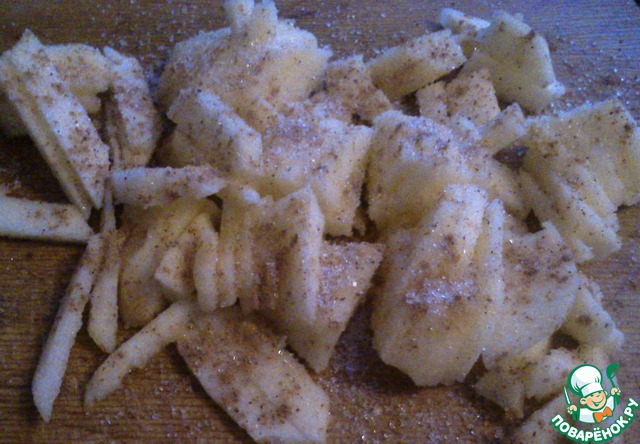 Яблоко почистить и нарезать соломкой, смешать с корицей и оставшимся сахаром.