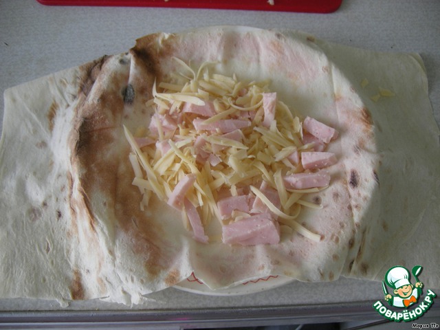 Лаваш разрезаем на 3 полоски, кладём начинку.