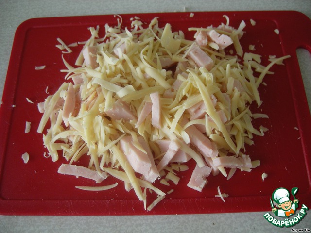 Нарезать ветчину бруском, сыр натереть на крупной тёрке.