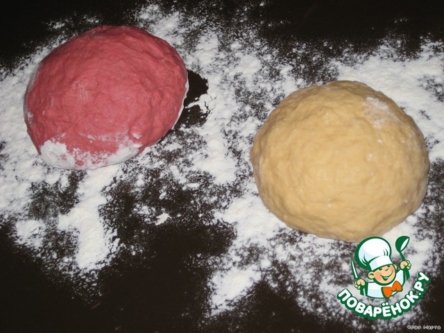 Готовим два вида теста - одно из свекольного сока, яйца и муки, другое - из морковного сока, яйца и муки.