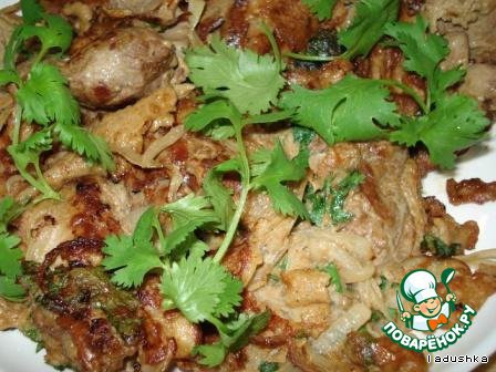 У кинзы отрываем маленькие веточки, добавляем к печени, соль, черный перец, паприка по вкусу.