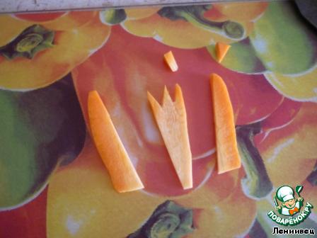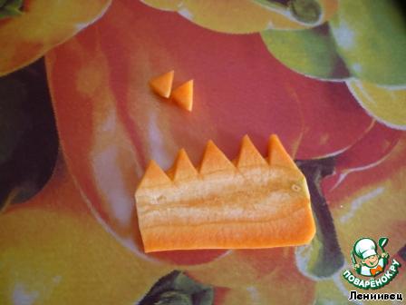 Сделаем хохолок и хвостик из моркови: зигзагообразные надрезы - и готово. Треугольнички не выбрасываем и не съедаем, из них сделаем клювик.