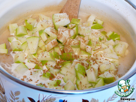 Добавить в кашу яблоки, корицу и сливки.
