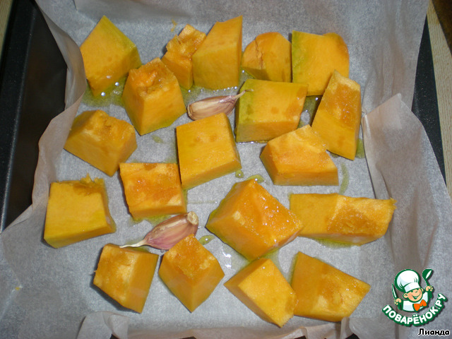 Для приготовления запеканки необходимо: тыкву нарезать небольшими кусочками, сбрызнуть оливковым маслом и запечь с двумя зубцами неочищенного чеснока в духовке при 180* минут 25. Затем, блендером, тыкву и очищенный чеснок, превратить в пюре.