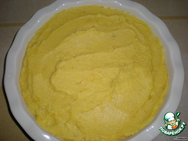 Пока тыква с мясом запекаются, нужно сварить картофель. Воду слить и картофель истолочь в пюре. В картофельное пюре добавить тыквенное пюре, сметану и натертый на мелкой терке имбирь.