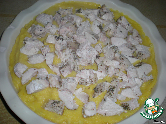Куриное филе нарезать некрупными кусочками. Разложить сверху на овощи и слегка "утопить" мясо в овощном пюре.