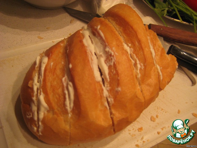 В батоне делаем глубокие разрезы поперек. Батон черствый, поэтому одна долька будет довольная толстенькая, но не пугайтесь, так вкусней будет!