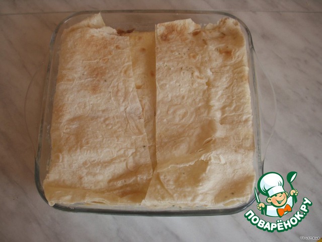 В нее кладем 2 лаваша так, чтобы края свисали, чтобы потом можно было ими накрыть начинку.