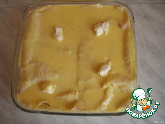 Сверху вылить остатки кефира с яйцом и выложить кусочки масла.