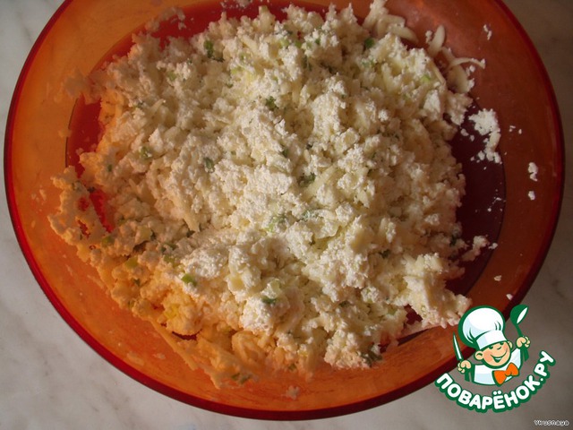 Остальные лаваши нарезать на куски произвольной формы, вымакать в смеси из кефира и яиц, немного отжать и в таком скомканном виде выложить в форму. Потом пересыпать сыром с творогом.