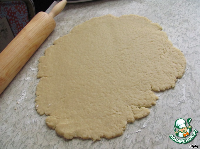 Выложите тесто на поверхность, слегка присыпанную мукой, и вымесите до однородности. Затем раскатайте в круг диаметром 30 см.